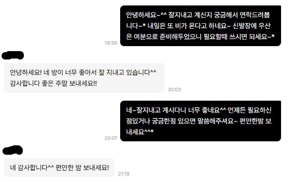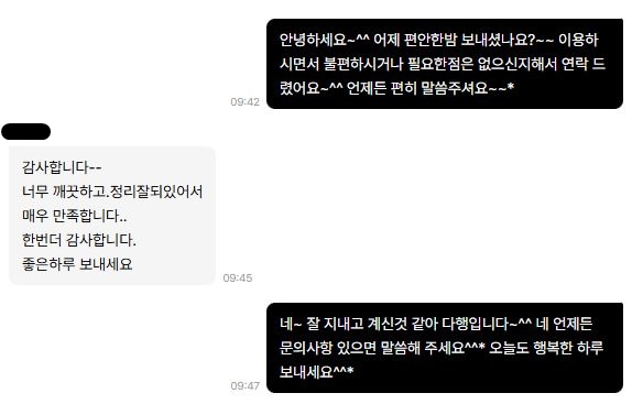 이번 숙소에서 인상 깊었던 요소 중 하나는 바로 호스트의 응대와 태도였습니다. 예약 전 문의했을 때부터 답변이 매우 빠르고 친절했는데요, 체크인 안내도 깔끔하게 정리되어 있어 누구나 쉽게 숙소를 이용할 수 있도록 배려되어 있었습니다. 특히 중간에 일정 변경이 있어 조심스럽게 문의드렸을 때도, 불편함 없이 유연하게 대응해주셔서 정말 감사했습니다. 숙소 내 세세한 부분까지 신경을 쓴 흔적이 느껴졌어요. 예를 들어, 전기 코드 위치라든지 필요한 생활용품의 위치 설명, 안내서 안의 작은 팁 하나까지도 게스트 입장에서 배려하고 준비하신 모습이었습니다. 그 덕분에 처음 이용하는 숙소임에도 불편함 없이 적응할 수 있었고, 마음까지 편하게 머물 수 있었어요. 단기임대 숙소를 이용하면서 ‘호스트의 태도’가 얼마나 큰 차이를 만드는지 이번에 확실히 느낄 수 있었고, 이 호스트 분이라면 믿고 재예약도 가능하겠다는 확신을 갖게 됐습니다. 친절하고 세심한 응대를 원하시는 분들께 특히 강력 추천드립니다.